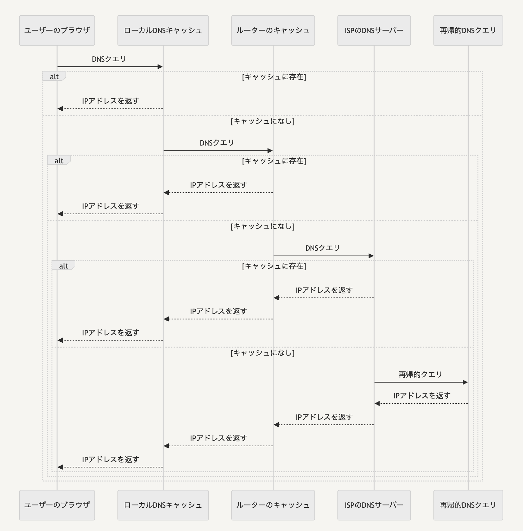 ISPのDNS → ルーターのキャッシュ → ローカルDNSのキャッシュ → ブラウザ